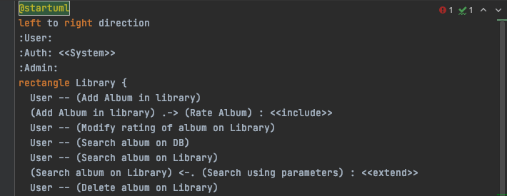 확장자명 .puml 을 사용해 파일을 만들어 PlantUML 텍스트를 사용하면 자동완성과 에러 체크 기능을 제공해준다.